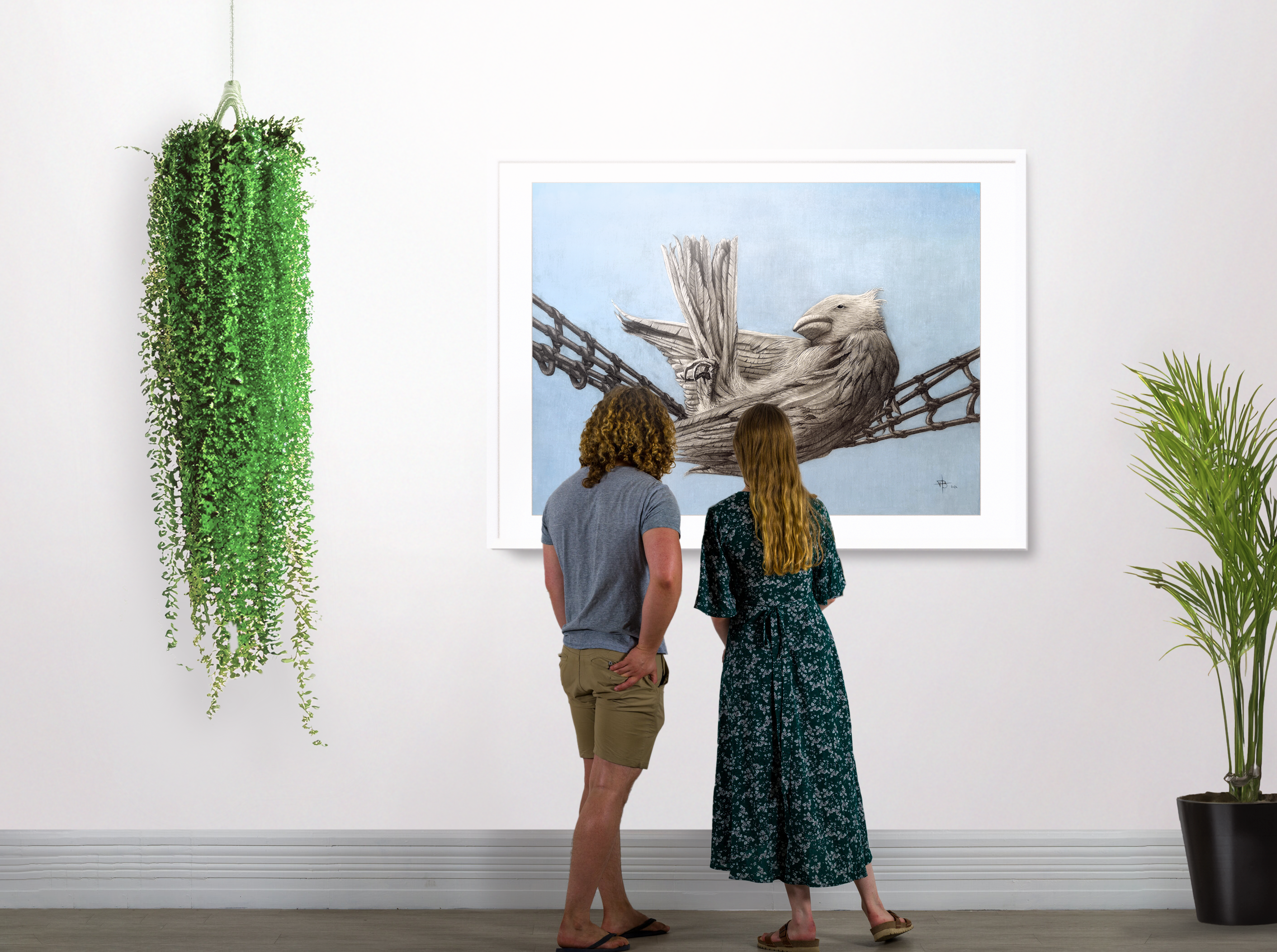 Dette værk portrætterer en død fugl, der hænger stille og fredfyldt i et rebnet mod en klar, blå himmel. Den udstrakte position med vingerne og halen spredt som i en sidste afslappet gestus skaber en næsten meditativ ro, som om fuglen svæver i en tidløs tilstand mellem liv og død. Detaljerne i fjerene og den bløde bue i kroppen fremhæver dens tidligere livskraft, nu frosset i en stilhed, der emmer af skønhed og vemod.