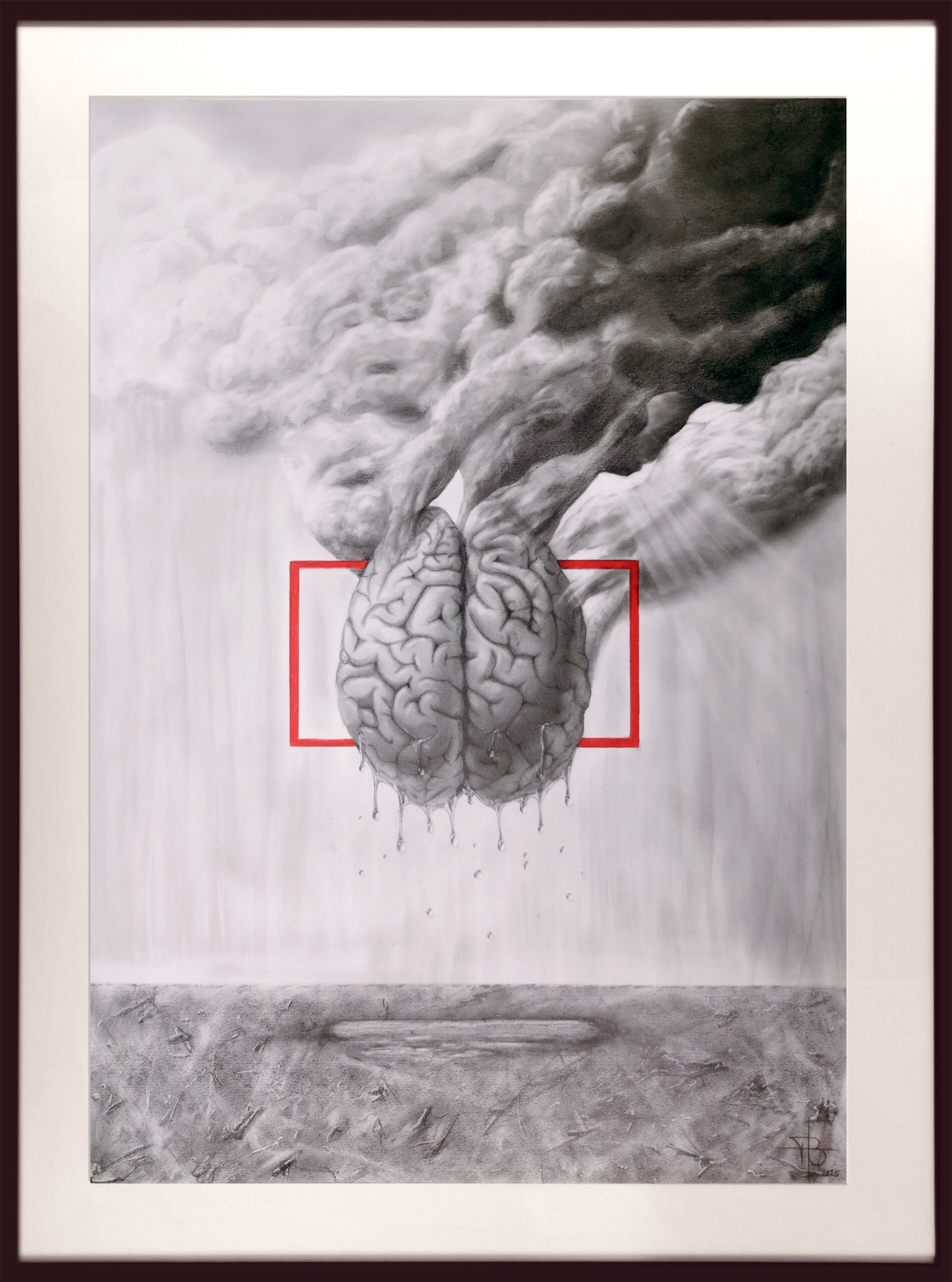 Dette kunstværk er både intenst og ildevarslende, en skildring af en hjerne, der svæver frit i et tomrum, men samtidig synes fanget i sin egen destruktive proces. Dens overflade er nøje gengivet i gråtoner, hvor den organiske tekstur drypper og smelter, som om den langsomt opløses under vægten af sine egne tanker. Fra dens øvre del strømmer tunge, mørke røgskyer opad, fortættede af en usynlig forbrænding, en indre overophedning, der sender varsler om en forestående kollaps.