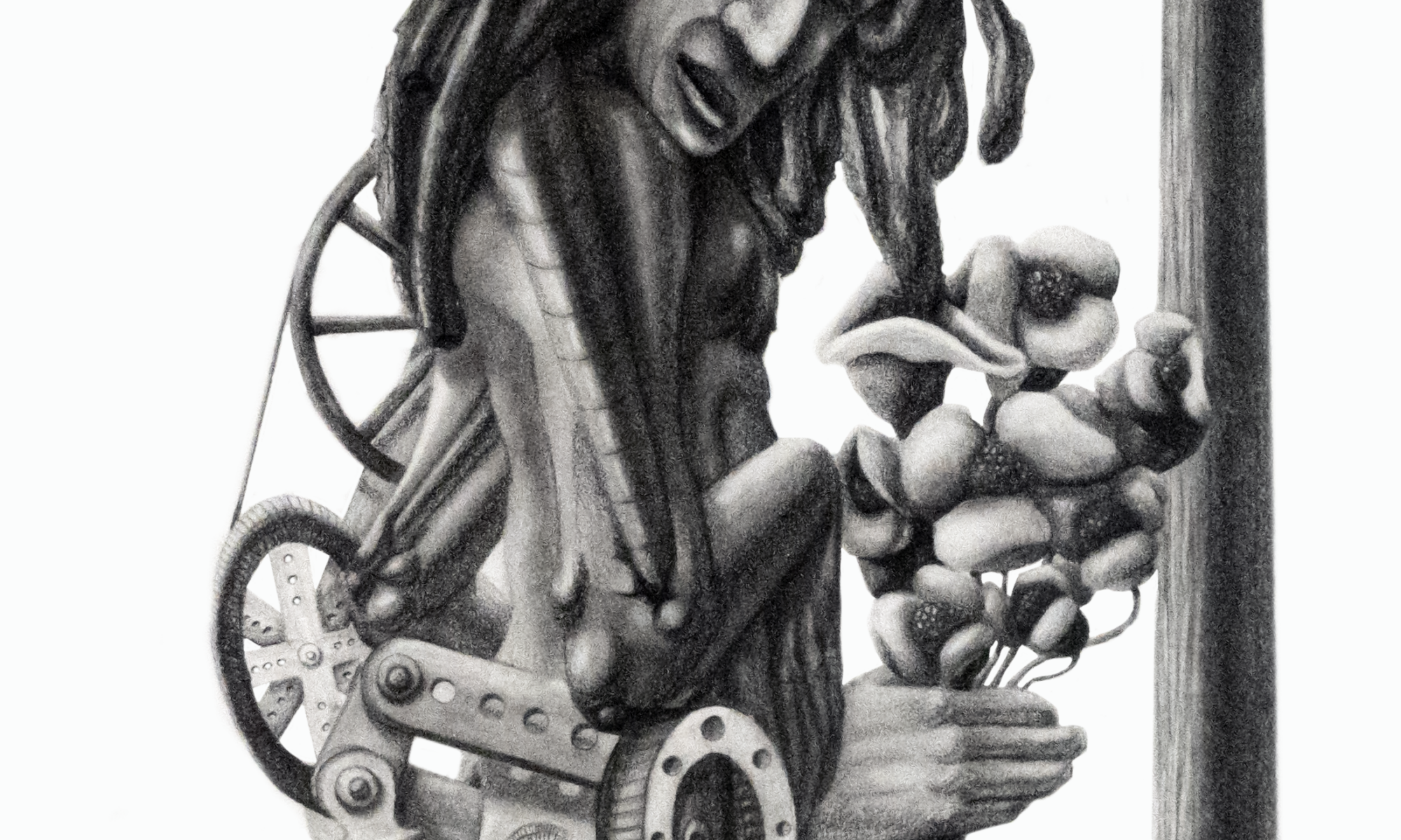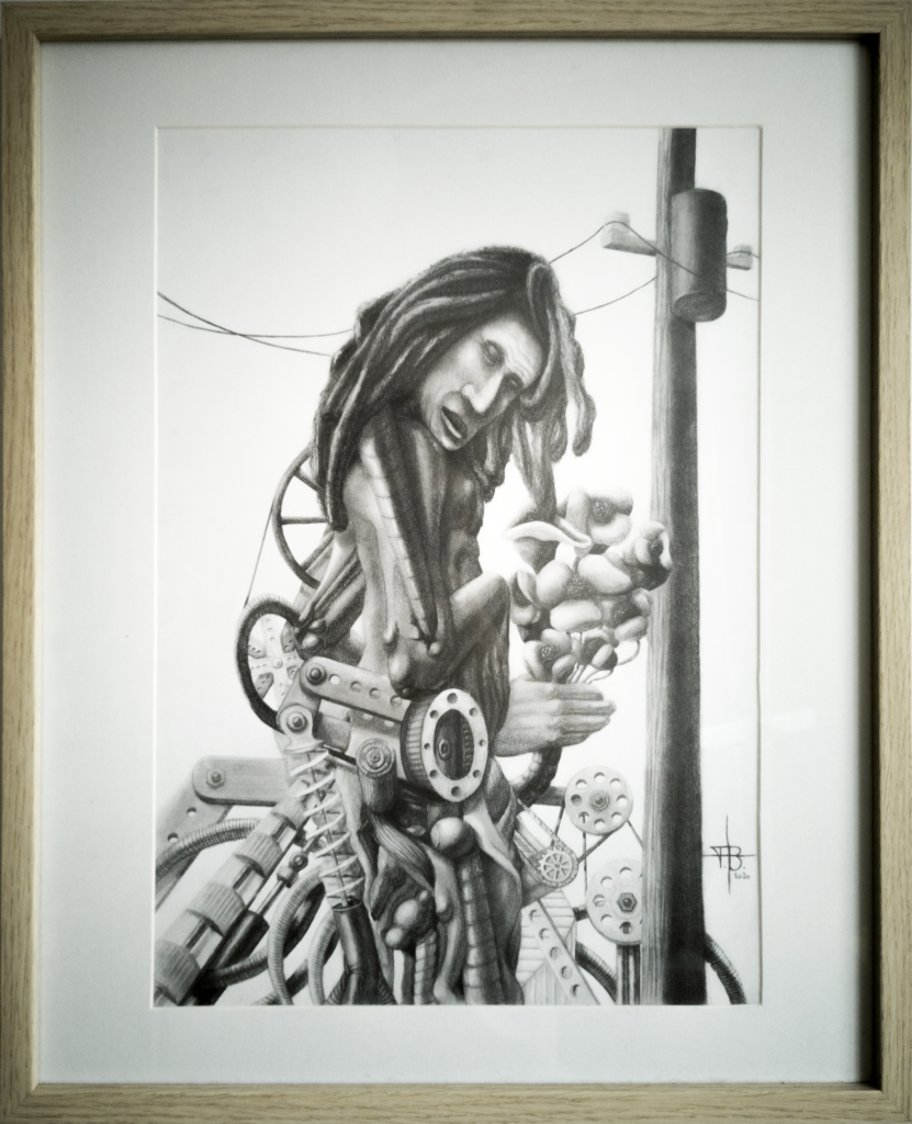 Ved siden af mannen rejser en lygtepæl sig som en tavs observatør af denne symbiose. Baggrunden er kridhvid og skaber en kontrast, der fremhæver kunstværkets kompleksitet. Hvert tandhjul og hver fjeder er en påmindelse om den skrøbelige balance mellem det menneskelige og det maskinelle. Når du lader øjnene dvæle på “The Machine Revelation” dykker du ned i en refleksion over menneskets forhold til teknologien, over samspillet mellem det organiske og det kunstigt konstruerede. Hvert blyantstrøg vækker tanken om integrationens skønhed og spændingen mellem det traditionelle og det futuristiske.